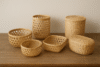 The warm, subdued hues of the material—soft greens, pale yellows, and honey tones—give the baskets a calming, organic presence that resonates with modern appreciation for natural materials.