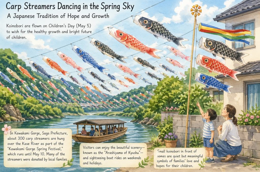 A recent news story highlights a particularly spectacular display of this tradition in Kawakami Gorge, Saga Prefecture. There, about 300 carp streamers have been hung across the Kase River, swimming through the air above the flowing water and bright spring scenery . This installation is part of the annual “Kawakami Gorge Spring Festival,” which runs until May 10. Interestingly, many of the streamers were donated by local families, giving new life to cherished items once used to celebrate their own children.