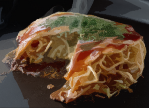 All ingredients are mixed together before grilling, resulting in a thick, fluffy pancake-like dish. It’s hearty and satisfying, and often considered the “standard” okonomiyaki style. - Hiroshima (Hiroshima-style Okonomiyaki)
