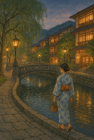町の風景自体も絵のように美しく、柳の並ぶ運河、趣のある旅館、そして小さな店が並んでいます。特に夜になると、街灯が通りを照らし、ミネラルを含んだ湯気の香りが漂い、幻想的な雰囲気に包まれます。