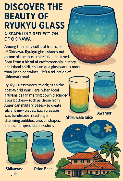 Among the many cultural treasures of Okinawa, Ryukyu glass stands out as one of the most colorful and beloved. Born from a blend of craftsmanship, history, and island spirit, this unique glassware is more than just a container—it’s a reflection of Okinawa’s soul.