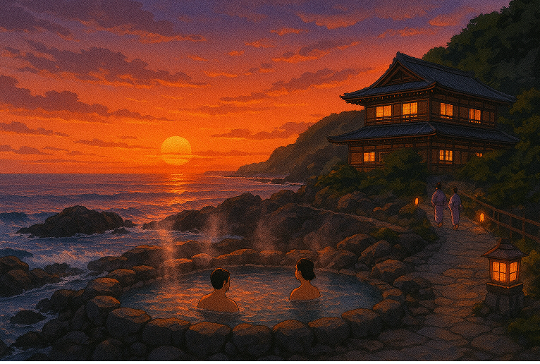 - Saki-no-Yu Outdoor Bath: An open-air bath right on the rocky coastline, where you can soak while listening to the crashing waves of the Pacific Ocean.
