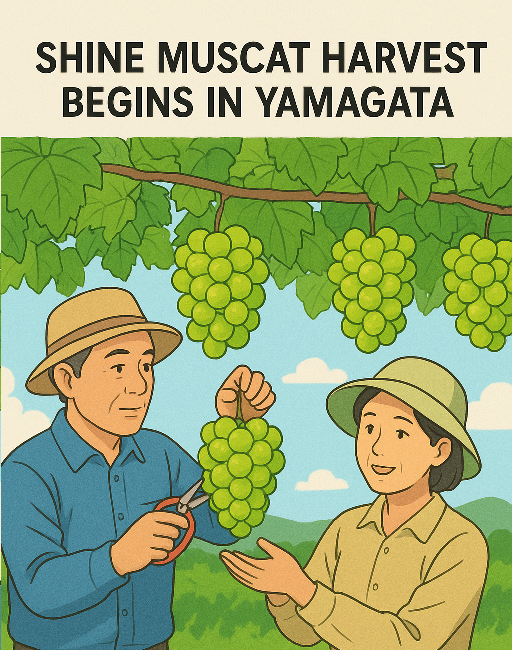 In Yamagata Prefecture, the harvest of the premium grape variety Shine Muscat has begun. Often called the “Queen of Grapes,” Shine Muscat has rapidly gained popularity in recent years as one of Japan’s most luxurious fruits. Known for its beautiful golden-green skin, plump berries, and rich sweetness, it is enjoyed not only when eaten fresh but also as a topping for shaved ice, parfaits, and other exquisite desserts.
