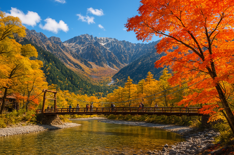 秋には、カラマツ林が鮮やかな黄色に染まり、常緑樹や雪をかぶった山々と美しく対比して、上高地は黄金の楽園へと変貌します。河童橋のような人気の場所では、穂高の山々が川に映る絵はがきのような景色を眺めることができ、静かな小径は、森や湿地帯、そして季節の色に燃える川辺へと訪問者を導きます。