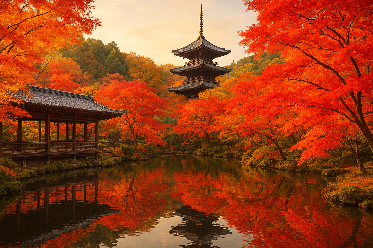The temple’s layout follows the natural slope of the Higashiyama mountains, and visitors can wander through winding paths, wooden corridors, and serene gardens surrounded by Japanese maples. The reflection of the autumn leaves on Hojo Pond, with the elegant pagoda rising in the distance, creates one of Kyoto’s most iconic seasonal scenes.
